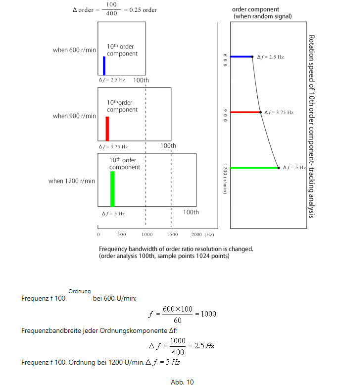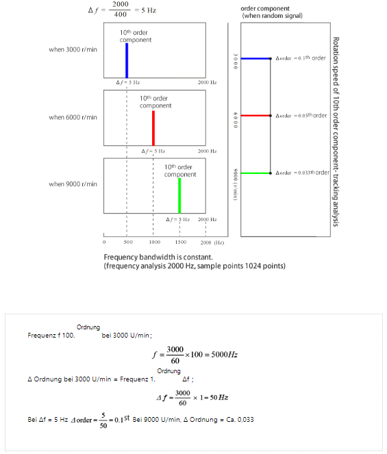 Bei der Verfolgungsanalyse mit konstanter Breite und der Frequenzanalyse sind bei Betrachtung von der Frequenzachse die maximale Analyseordnung und Ordnungsauflösung (Ordnungsbandbreite) basierend auf dem Frequenzbereich unabhängig von der Rotationsgeschwindigkeit konstant. Siehe Abbildung 10 im Vergleich zu Abbildung 11 wie folgt.