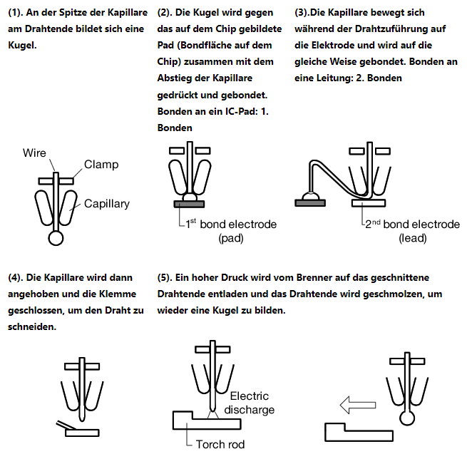 => Punktschweißen mit Hitze. Drücken Sie mit einem Golddraht und verbinden Sie ihn, indem Sie eine konstante Last, Wärme und Ultraschallvibration (beim Thermosonic-Bonden) auf den Draht anwenden